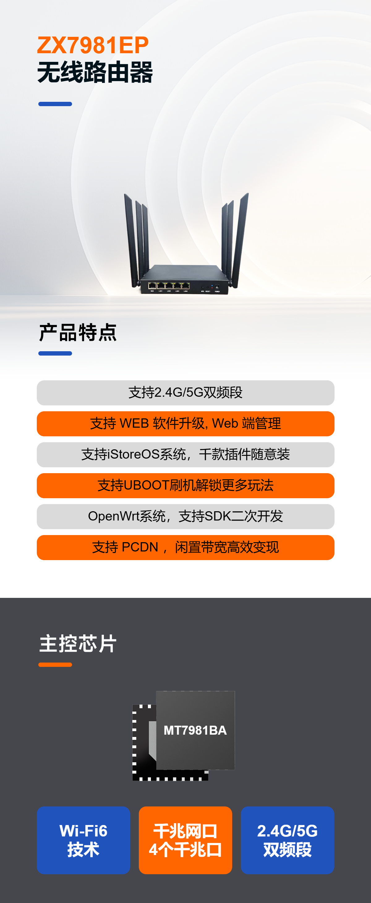 ZX7981EP路由器,一款可以赚钱的路由器,全新Wi-Fi6技术,全千兆网口,支持2.4G/5G双频道。1GB DDR4内存、8GB EMMC存储,SSD可选配128GB/256GB/512GB/1T/2T。