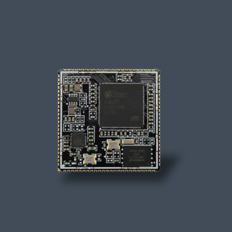 IDO-SOM2D0X-V1采⽤ Sigmastar SSD201/SSD202D SoC 设计,集成WIFI,NAND FLASH的⼀款⼩尺⼨邮票孔核⼼板。SSD201/SSD202D 采⽤双核ARM A7 1.2GHz 主频,⽚内集成64M/128MB ⾼速DDR,2D图形加速和H.264/H.265硬件解码; ⽀持RGB/TTL和MIPI两种屏幕驱动接⼝,显示分辨率⾼达1080P@60Hz;内置⾳频Codec,⽀持数字四⻨克⻛阵列;两路EMAC,⽀持双⽹⼝,内置1路PHY; 丰富的外部接⼝, 2xUSB, 4xPWM, 3xI2C, 1XSDIO, 1xSPI,  1xIR , ,1XIIS, 70xGPIO 等。