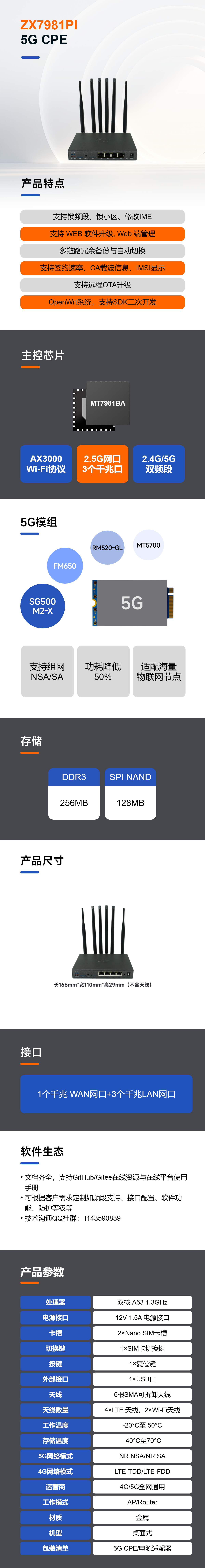 ZX7981PI 工业级 5G 插卡路由器,是基于全新硬件平台开发的智能无线接入终端,延续工业级设备 “高可靠、强耐受、广适配” 核心属性,同时以技术升级赋能工业物联网(IoT)场景 ,替代传统宽带或作为应急备份网络。