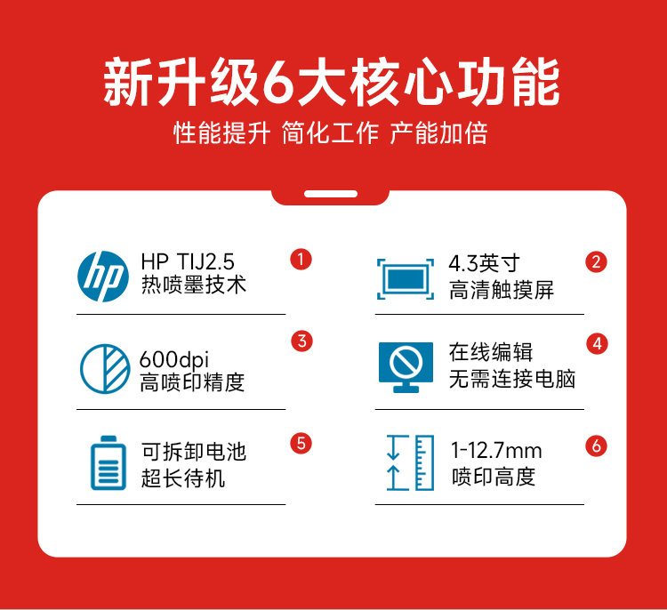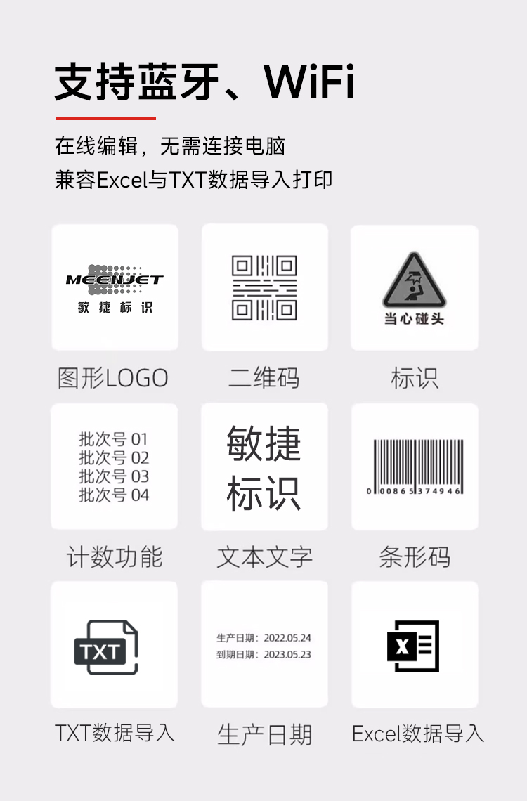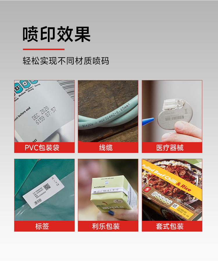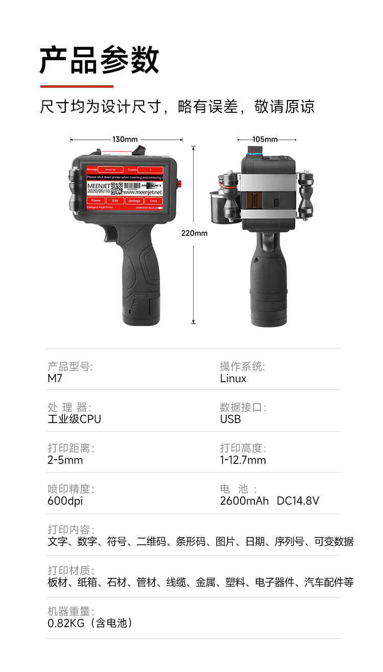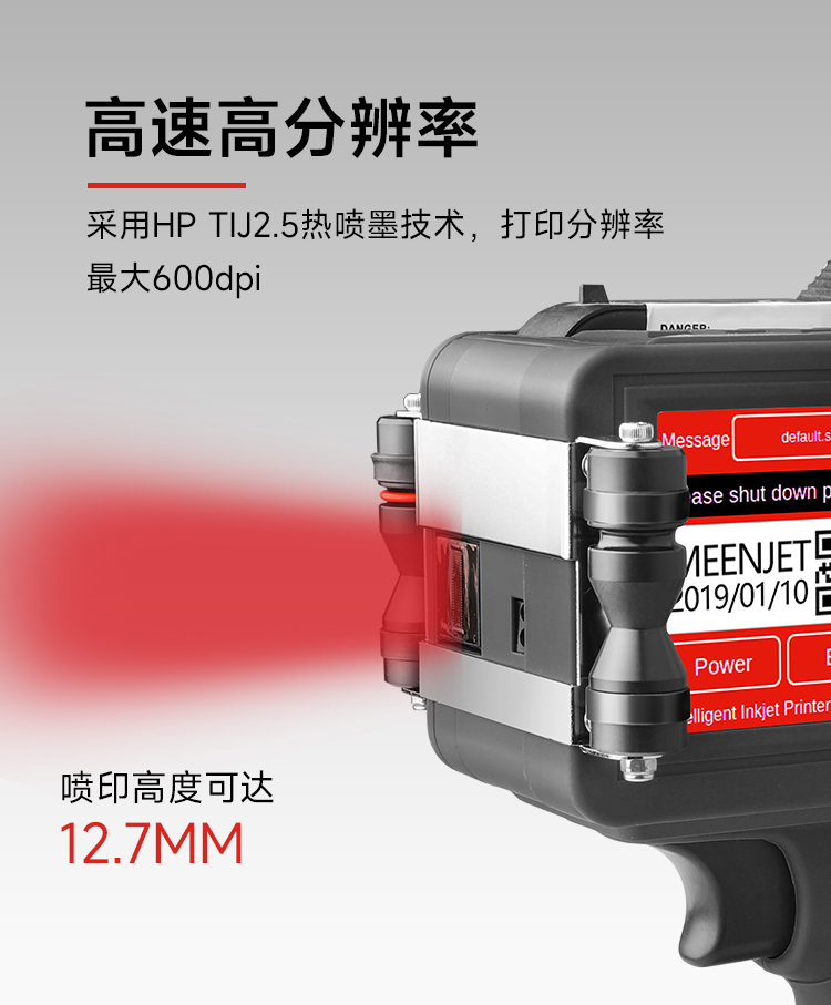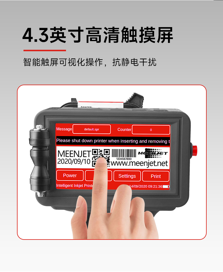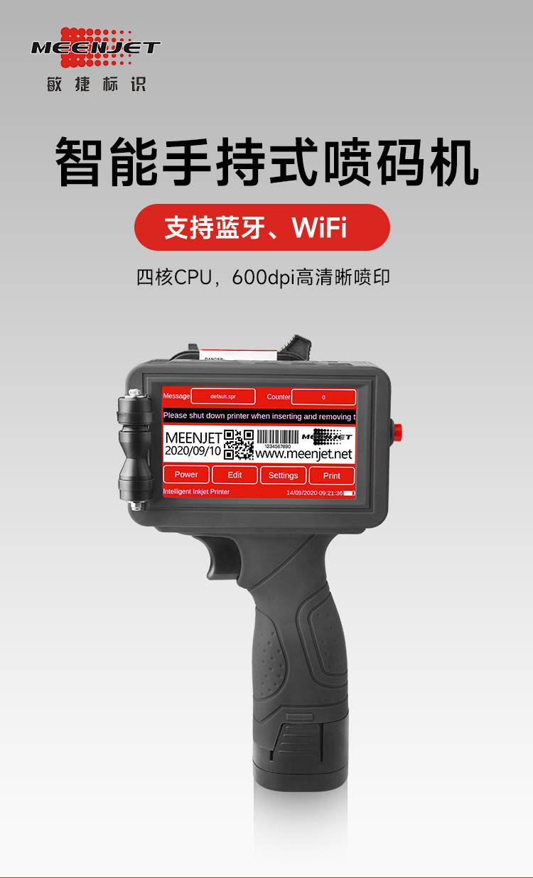 内置嵌入式智能操作系统,支持U盘导入数据库打印,原装进口打印引擎,配合进口的各类墨水,适用于喷印各种材料和领域,360度全方位喷码,手持在线两用,支持本机在线直接编辑喷印内容与修改参数,无需链接电脑。